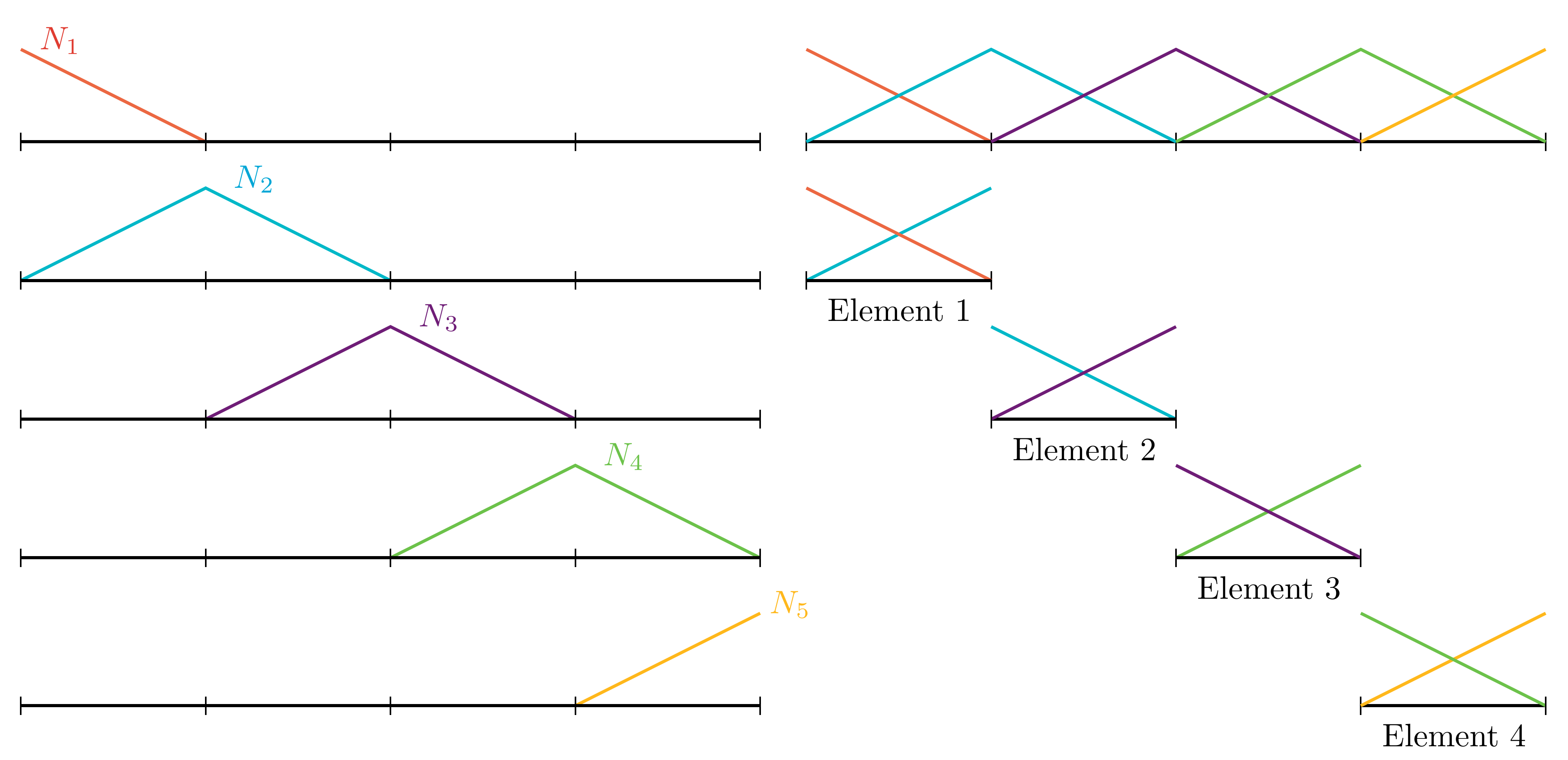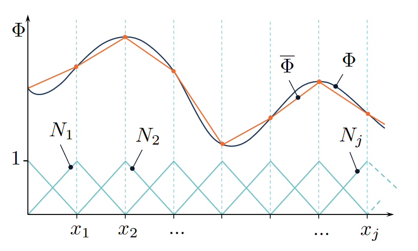 2.5. Elements and shape functions — CiTG Jupyter Book template (tudelft.nl) By finding the proper linear combination, we can visually verify that \bar{\Phi} = \sum_i N_i can approximate the given \Phi properly:
