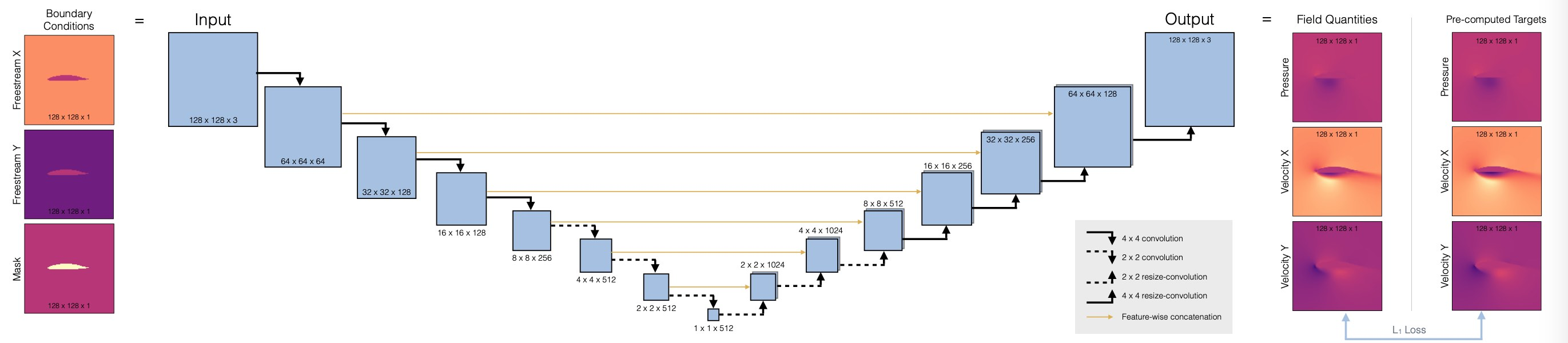 Supervised training for RANS flows around airfoils — Physics-based Deep Learning \text{arg min}_{\theta} \sum_i ( f_\theta(x_i)-y_i )^2where x_i are the boundary conditions shown on the left side of the figure, and the target y_i are the pre-computed field quantities like pressure and velocity on the right side.