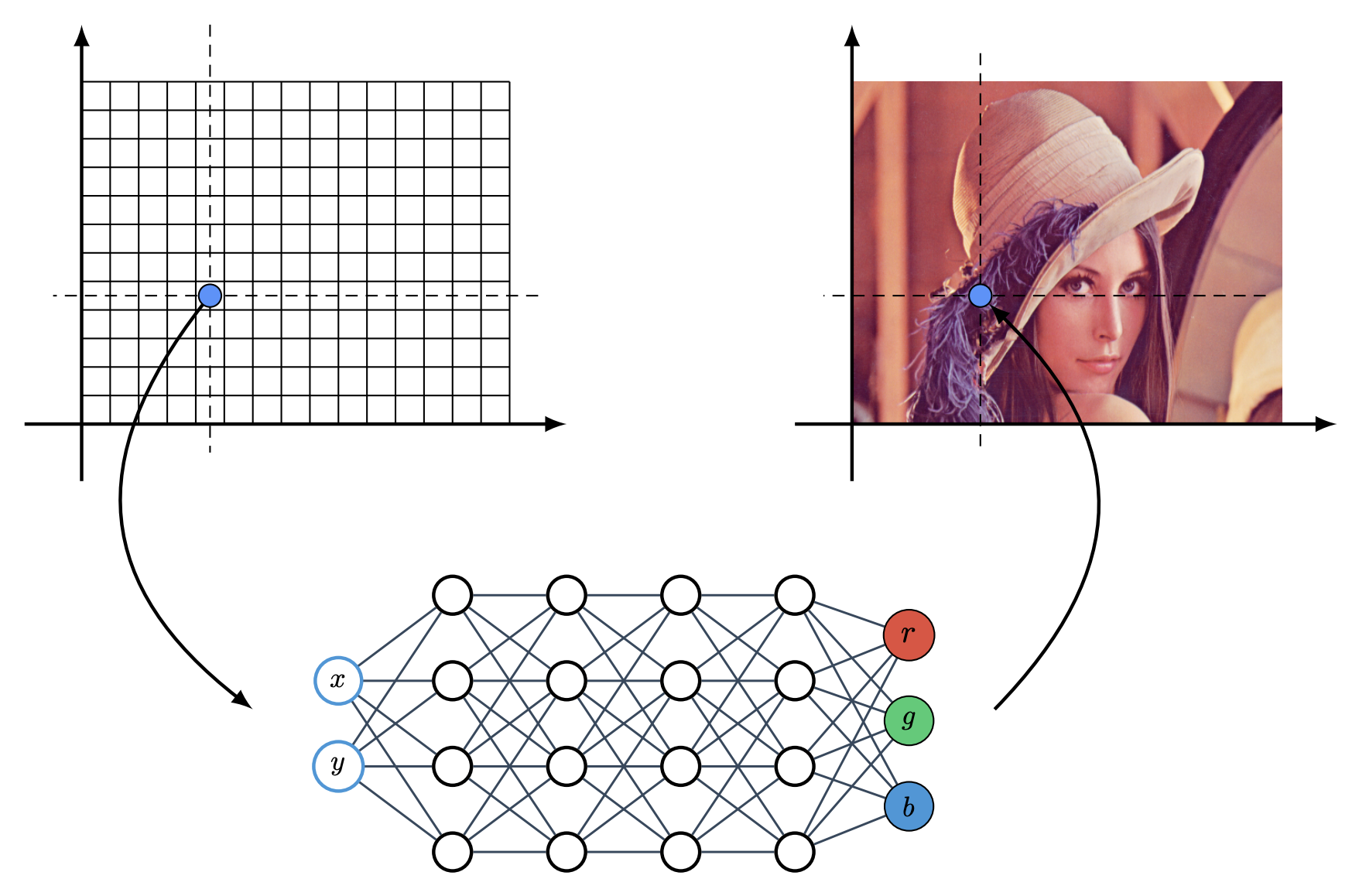If this NN can approximate the given image properly, it significantly reduces the required memory to store the data. This is a extreme example with exaggeration, but highlights the efficiency of INR.